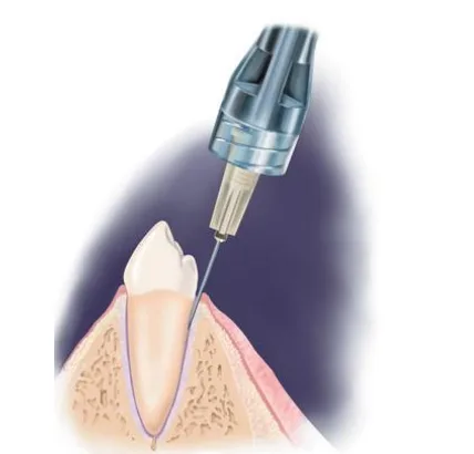 Nel caso dell’anestesia al singolo dente, la “bacchetta magica” – Wand, non perfora la gengiva, ma si inserisce delicatamente nel solco gengivale, in quell’aera di non aderenza fisiologica tra dente e gengiva.